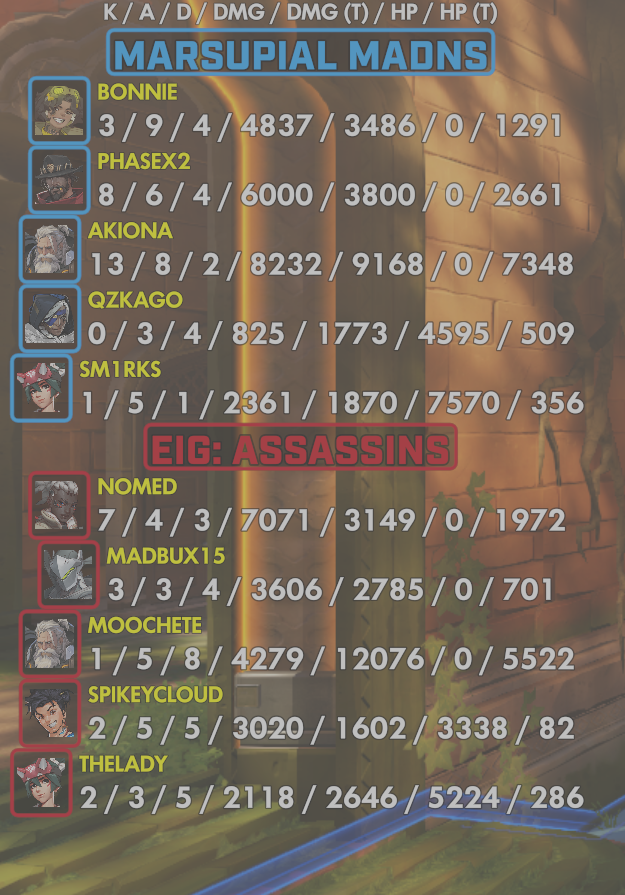 10 entries| Team | Player | Kills | Assists | Deaths | Damage | Damage (Taken) | Healing | Healing (Taken) |