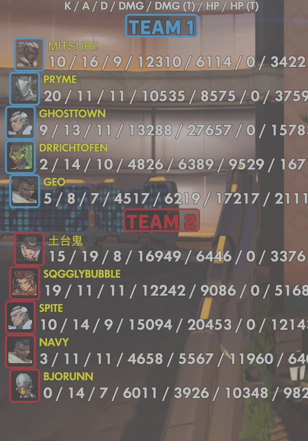 6 entries| Team | Player | Kills | Assists | Deaths | Damage | Damage (Taken) | Healing | Healing (Taken) |