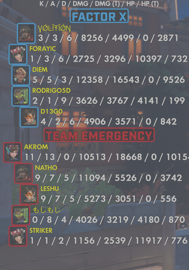 4 entries| Team | Player | Kills | Assists | Deaths | Damage | Damage (Taken) | Healing | Healing (Taken) |