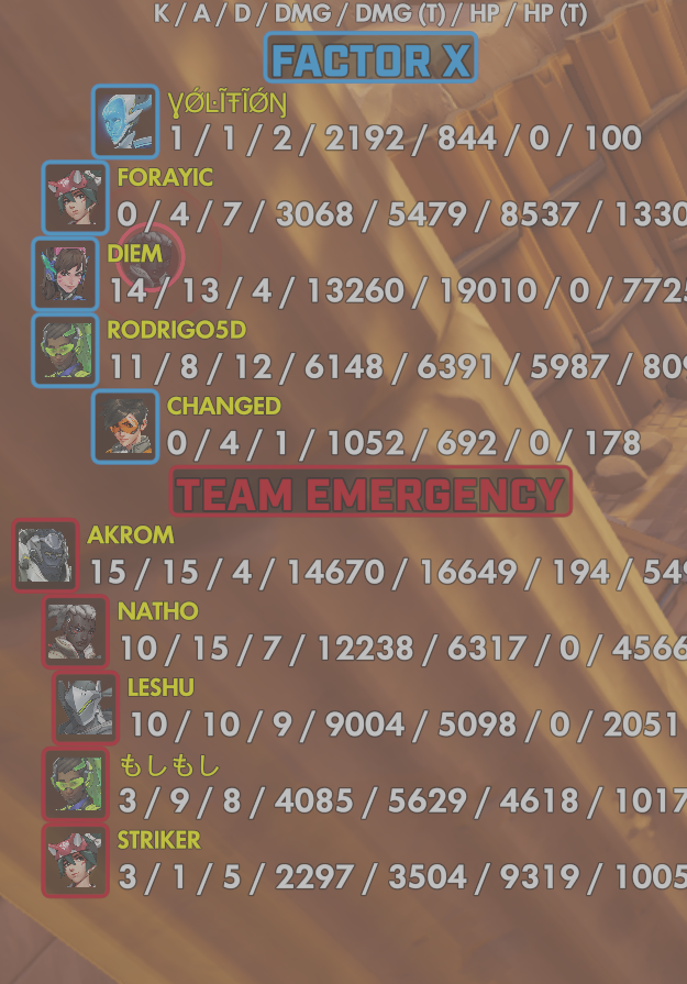 10 entries| Team | Player | Kills | Assists | Deaths | Damage | Damage (Taken) | Healing | Healing (Taken) |