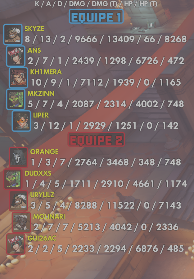 10 entries| Team | Player | Kills | Assists | Deaths | Damage | Damage (Taken) | Healing | Healing (Taken) |