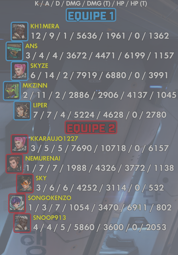 10 entries| Team | Player | Kills | Assists | Deaths | Damage | Damage (Taken) | Healing | Healing (Taken) |
