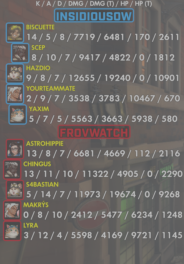 10 entries| Team | Player | Kills | Assists | Deaths | Damage | Damage (Taken) | Healing | Healing (Taken) |