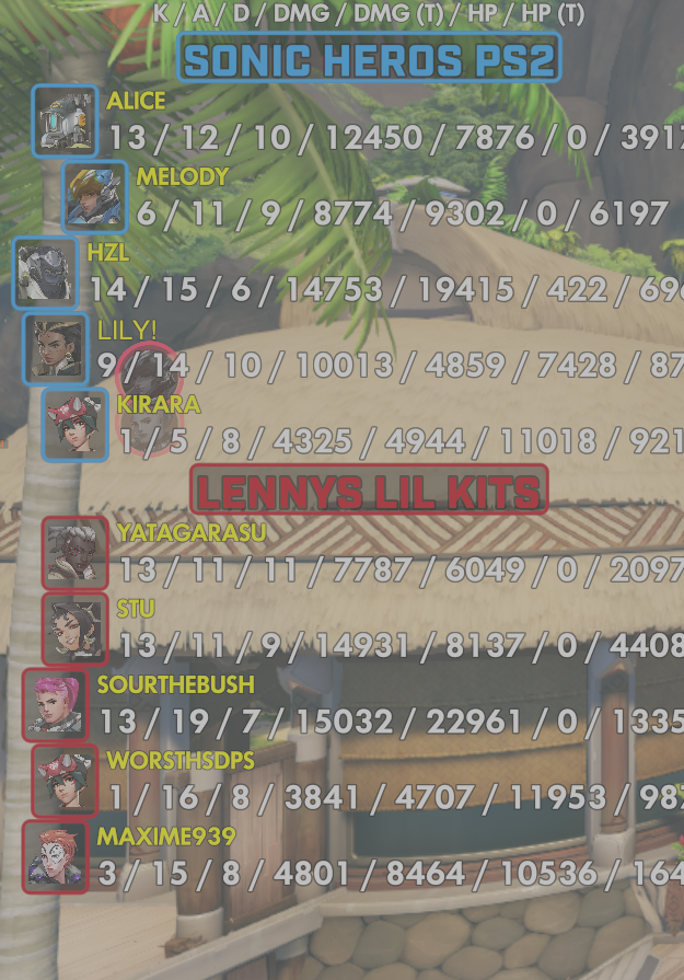10 entries| Team | Player | Kills | Assists | Deaths | Damage | Damage (Taken) | Healing | Healing (Taken) |