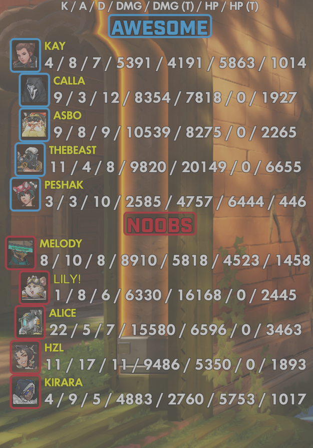 10 entries| Team | Player | Kills | Assists | Deaths | Damage | Damage (Taken) | Healing | Healing (Taken) |