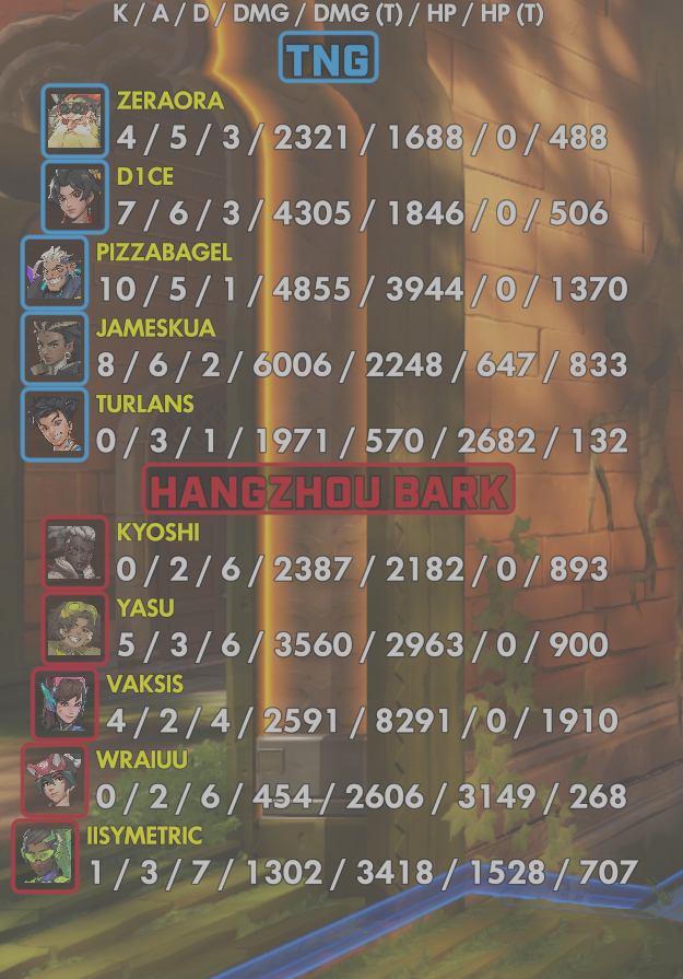 10 entries| Team | Player | Kills | Assists | Deaths | Damage | Damage (Taken) | Healing | Healing (Taken) |