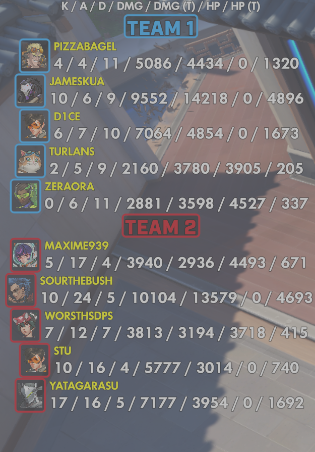 10 entries| Team | Player | Kills | Assists | Deaths | Damage | Damage (Taken) | Healing | Healing (Taken) |