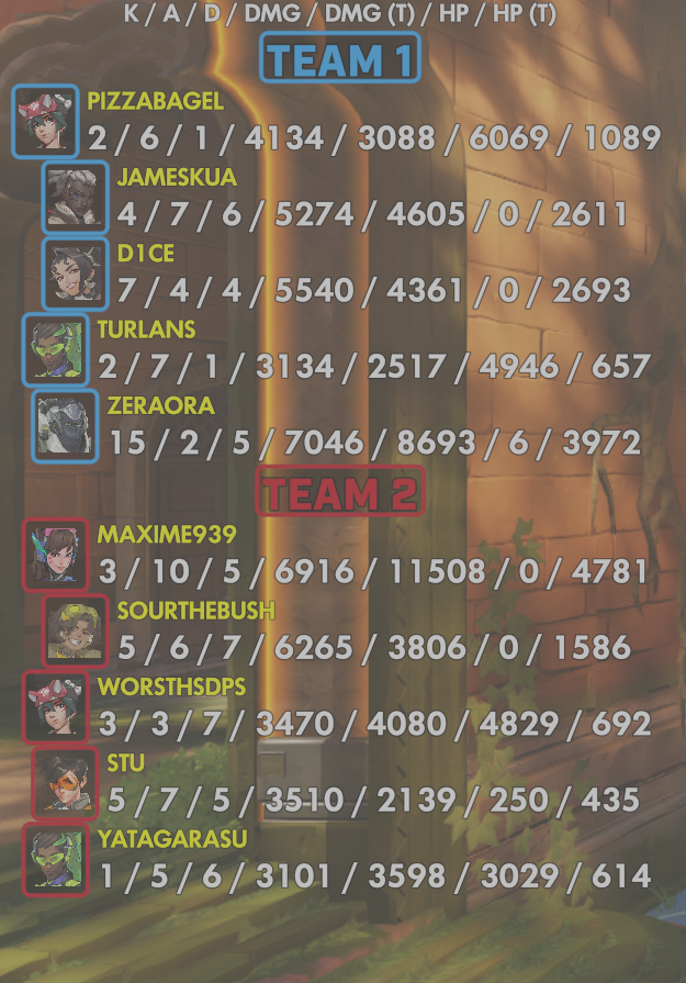 10 entries| Team | Player | Kills | Assists | Deaths | Damage | Damage (Taken) | Healing | Healing (Taken) |