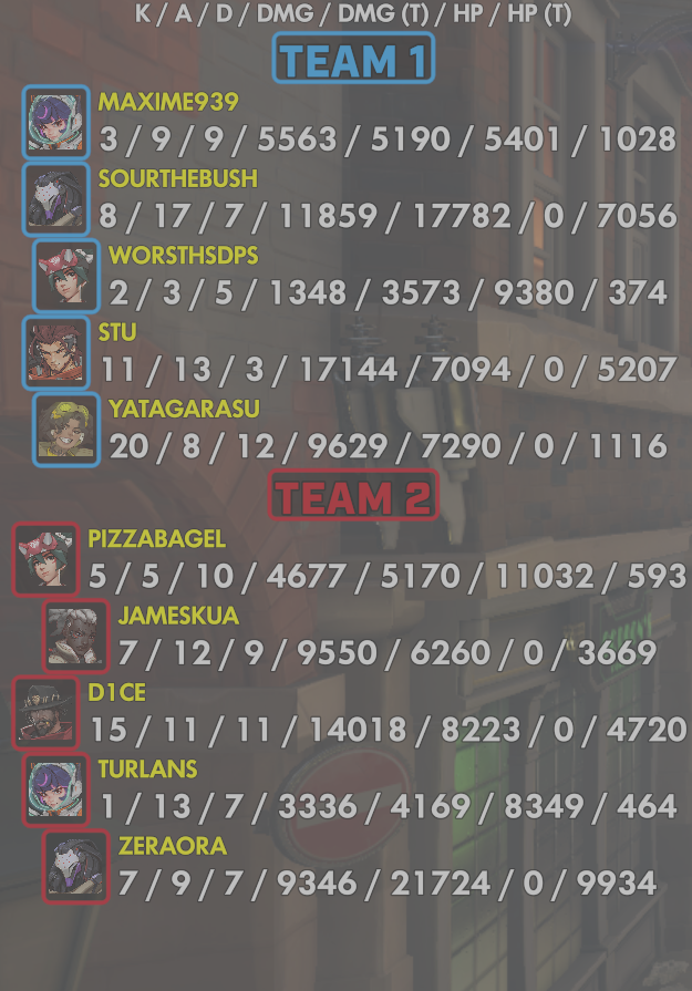 10 entries| Team | Player | Kills | Assists | Deaths | Damage | Damage (Taken) | Healing | Healing (Taken) |