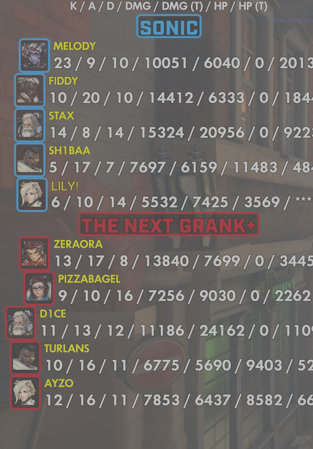 10 entries| Team | Player | Kills | Assists | Deaths | Damage | Damage (Taken) | Healing | Healing (Taken) |