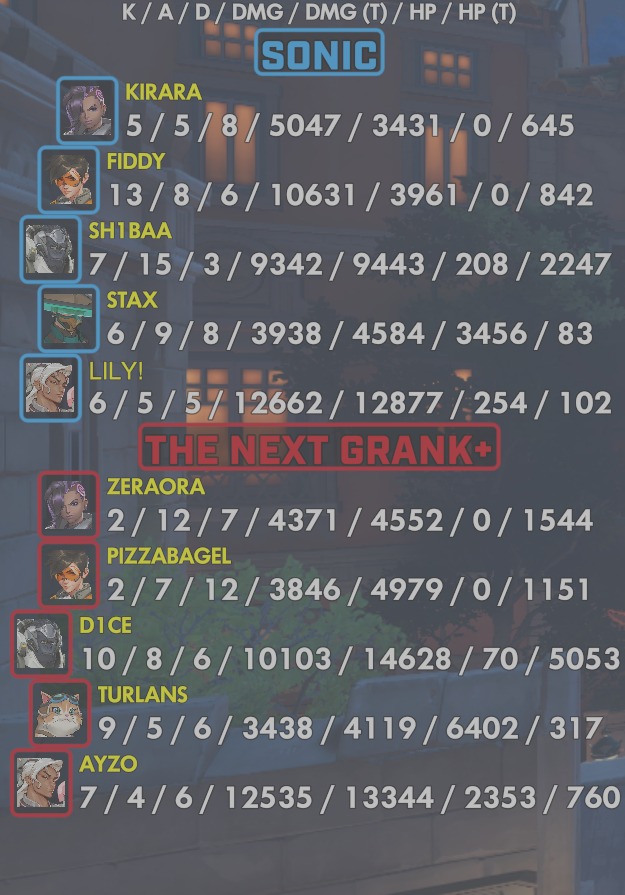 10 entries| Team | Player | Kills | Assists | Deaths | Damage | Damage (Taken) | Healing | Healing (Taken) |