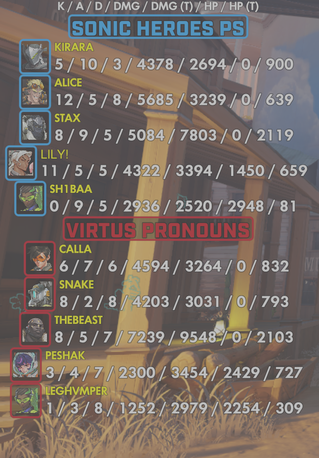 10 entries| Team | Player | Kills | Assists | Deaths | Damage | Damage (Taken) | Healing | Healing (Taken) |