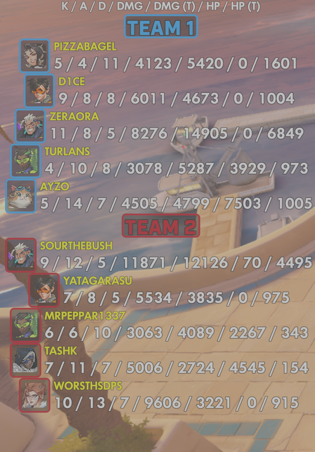 10 entries| Team | Player | Kills | Assists | Deaths | Damage | Damage (Taken) | Healing | Healing (Taken) |
