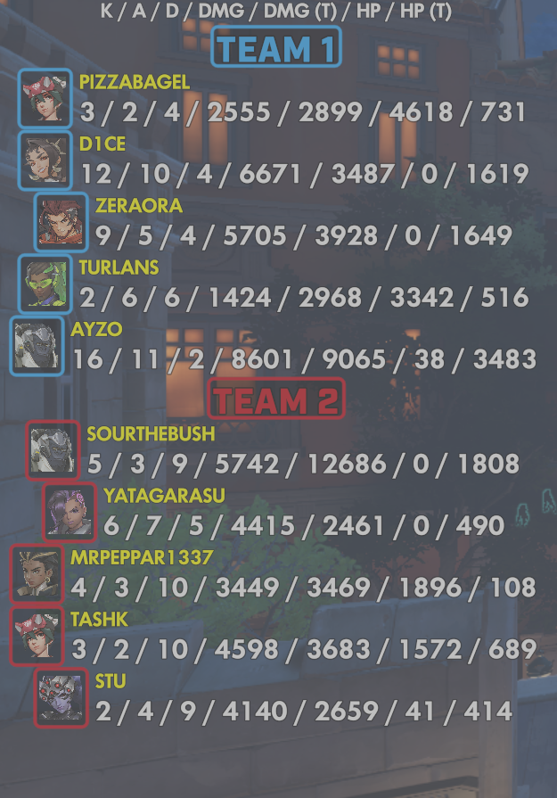 10 entries| Team | Player | Kills | Assists | Deaths | Damage | Damage (Taken) | Healing | Healing (Taken) |