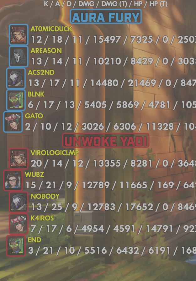 10 entries| Team | Player | Kills | Assists | Deaths | Damage | Damage (Taken) | Healing | Healing (Taken) |
