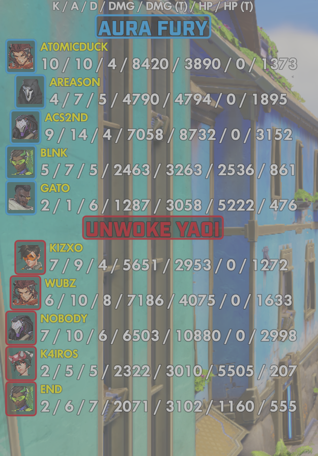 10 entries| Team | Player | Kills | Assists | Deaths | Damage | Damage (Taken) | Healing | Healing (Taken) |