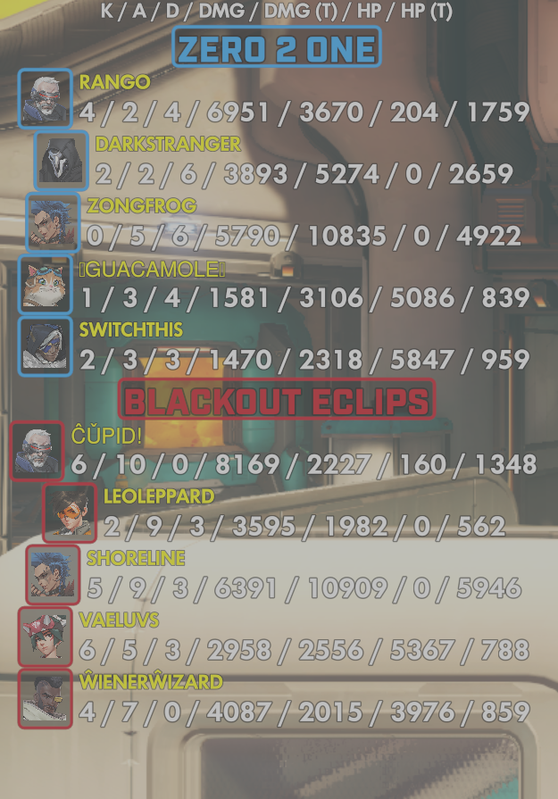 10 entries| Team | Player | Kills | Assists | Deaths | Damage | Damage (Taken) | Healing | Healing (Taken) |