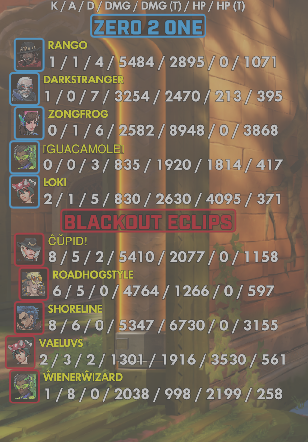 10 entries| Team | Player | Kills | Assists | Deaths | Damage | Damage (Taken) | Healing | Healing (Taken) |