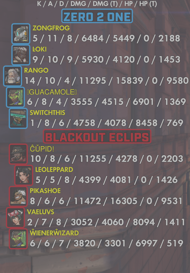 10 entries| Team | Player | Kills | Assists | Deaths | Damage | Damage (Taken) | Healing | Healing (Taken) |