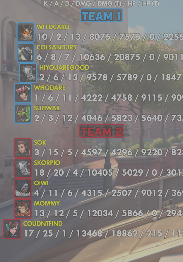 10 entries| Team | Player | Kills | Assists | Deaths | Damage | Damage (Taken) | Healing | Healing (Taken) |