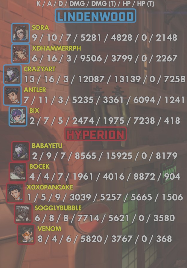 10 entries| Team | Player | Kills | Assists | Deaths | Damage | Damage (Taken) | Healing | Healing (Taken) |