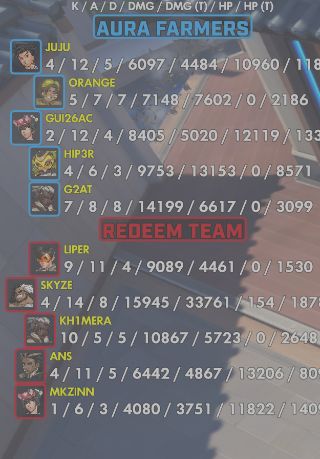 10 entries| Team | Player | Kills | Assists | Deaths | Damage | Damage (Taken) | Healing | Healing (Taken) |